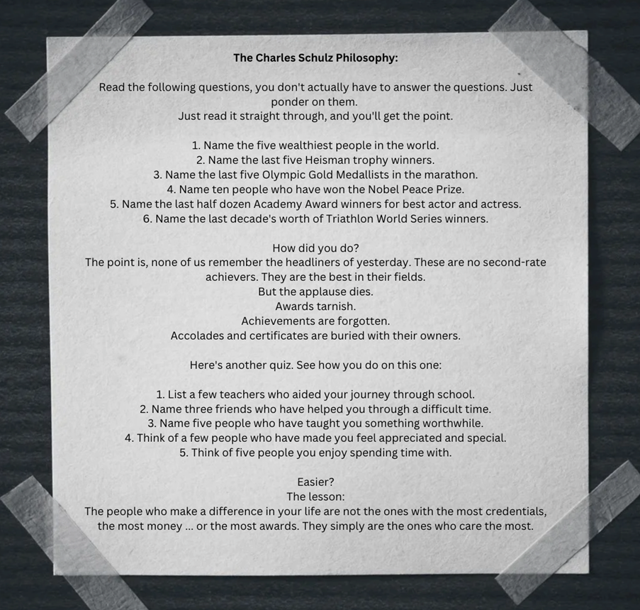 Schulz's philosophy poses a simple yet profound challenge: can you name the top achievers in various fields, from sports to entertainment to academia? While we may recall a few, the majority fade into obscurity as time passes. Awards tarnish, achievements are forgotten, and the applause inevitably dies.